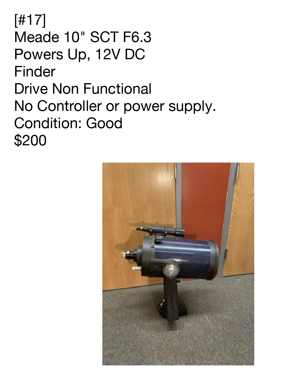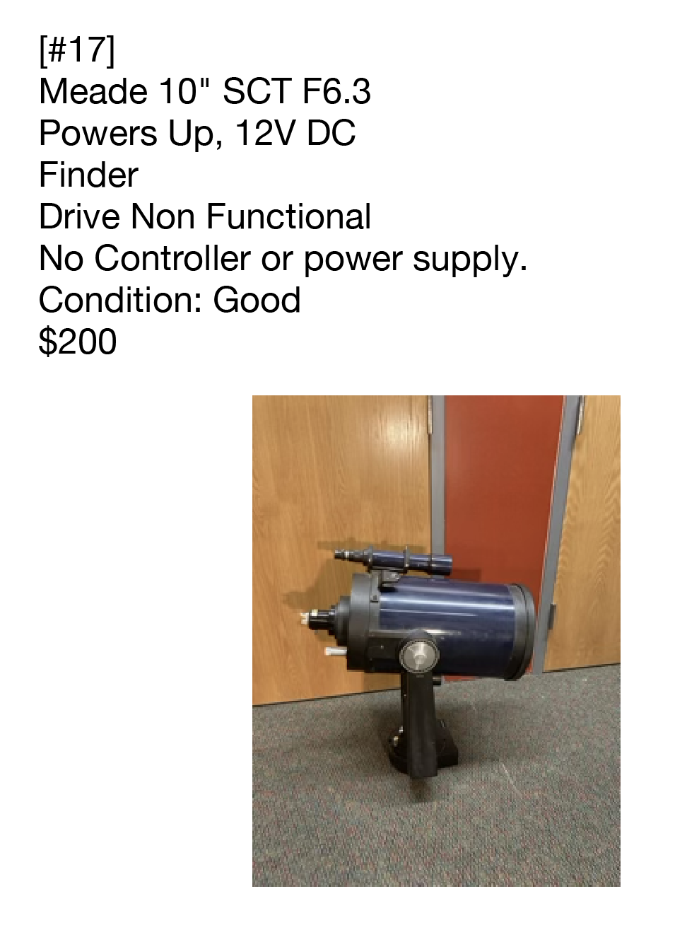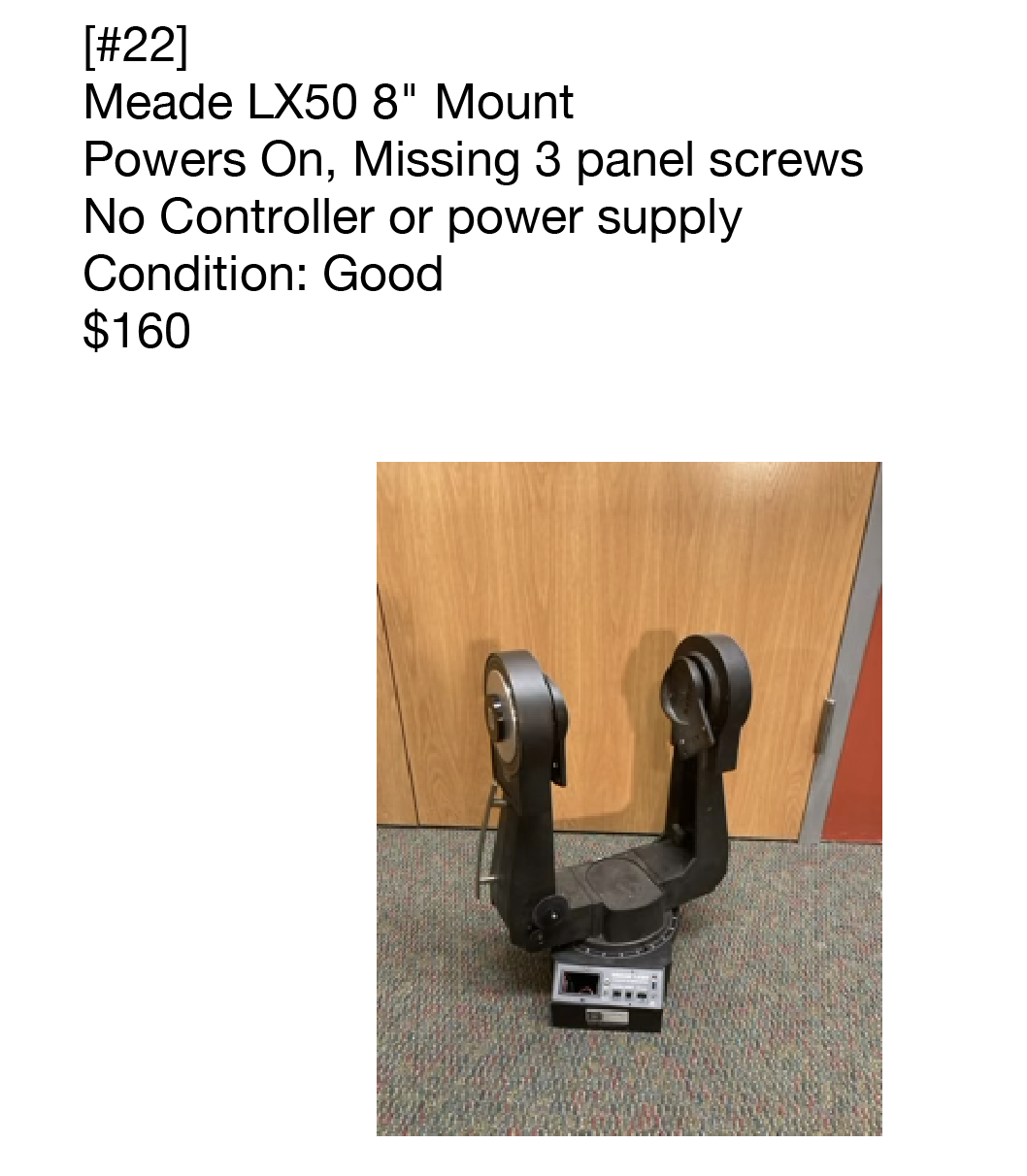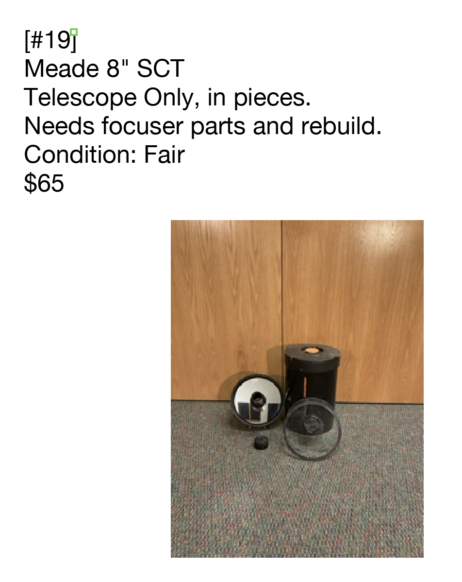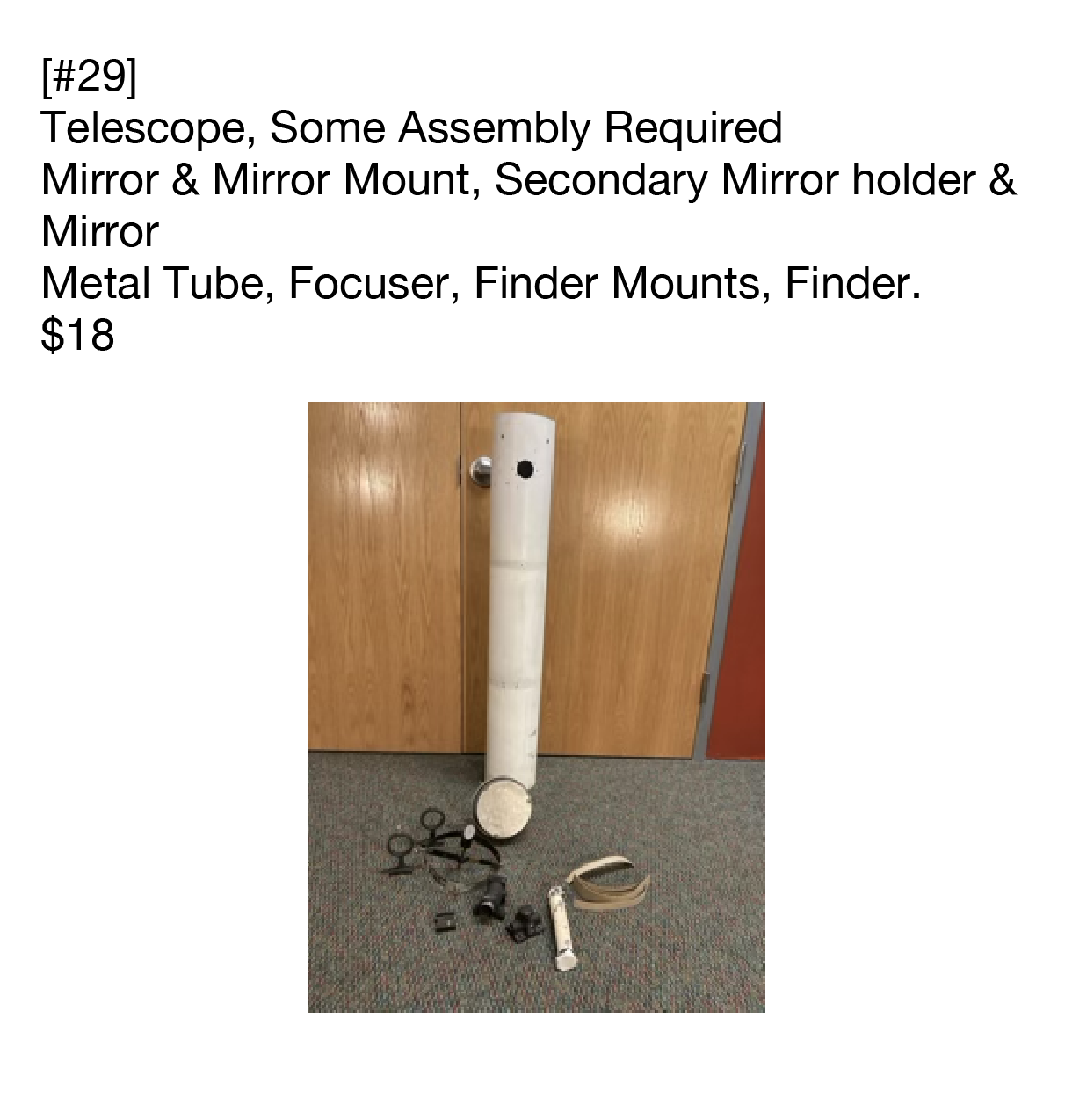 Send a list of your items to swapmeet@cinastro.org and we will add it to this page before the event date.