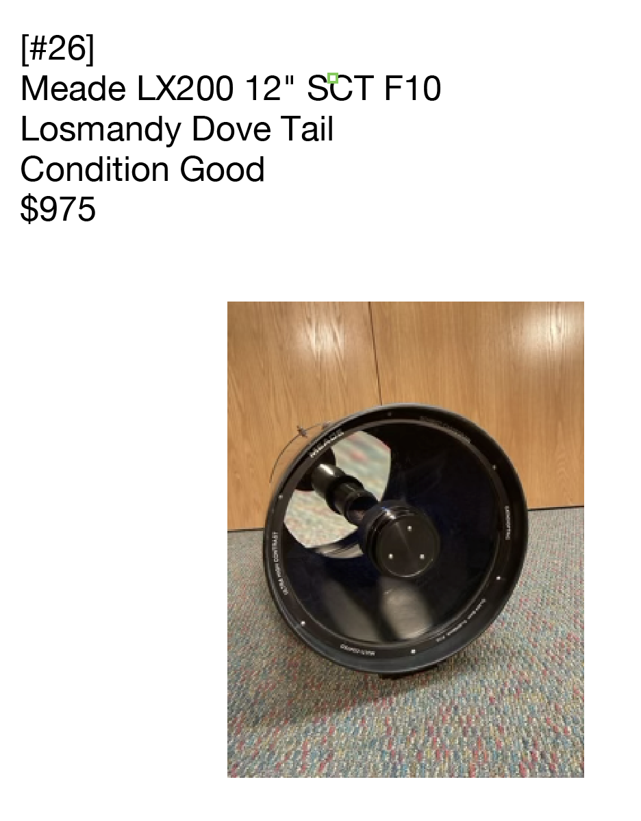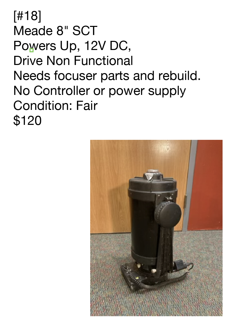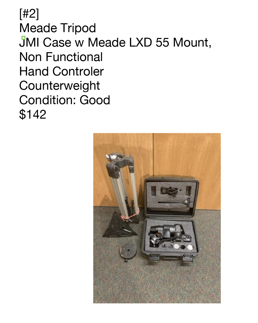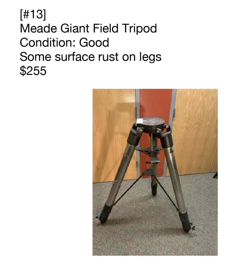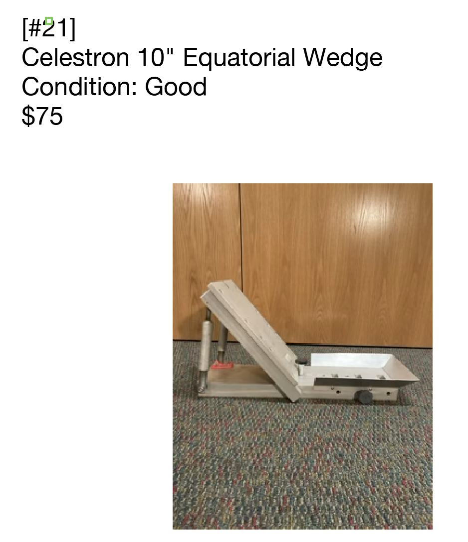 Send a list of your items to swapmeet@cinastro.org and we will add it to this page before the event date.