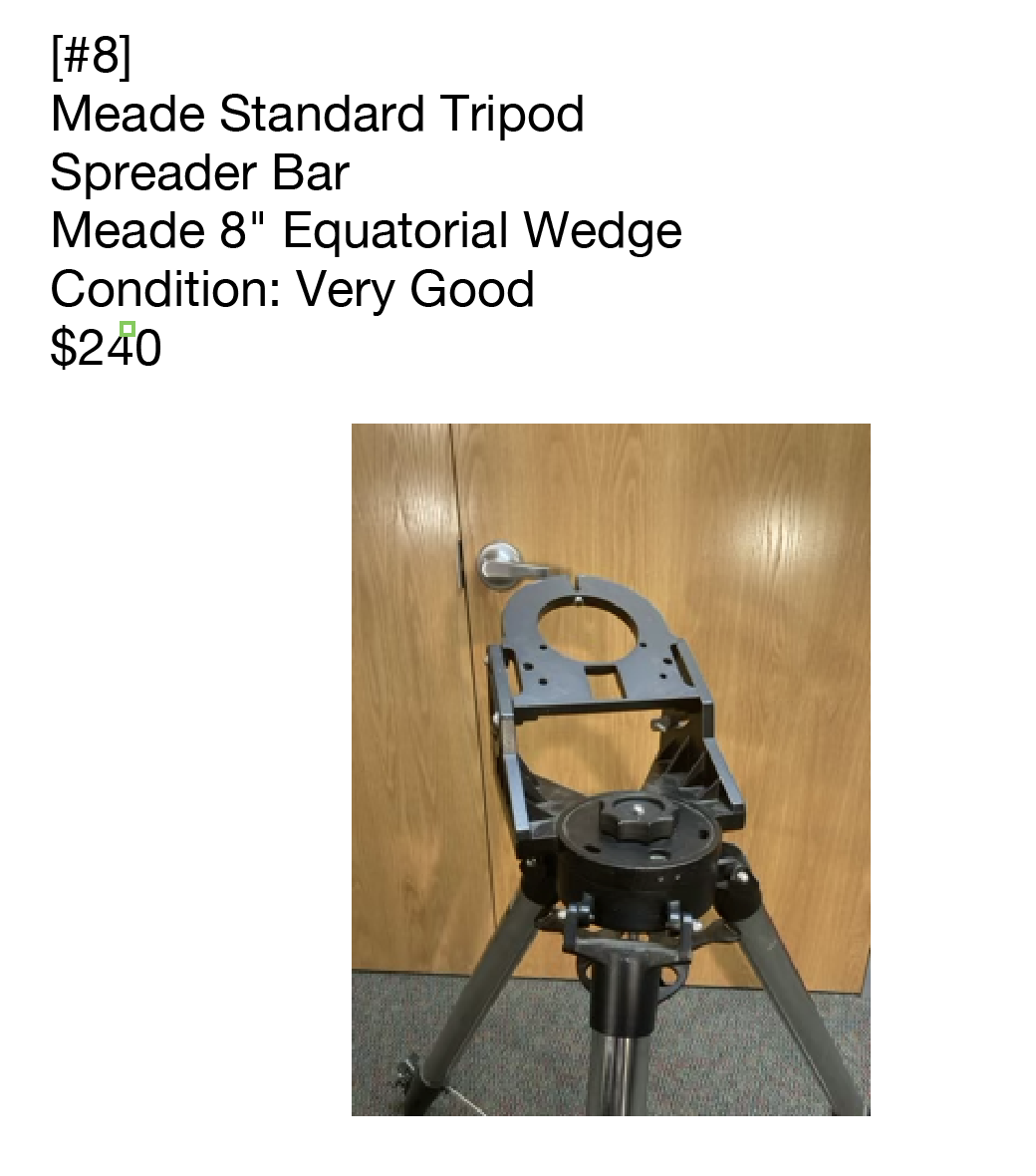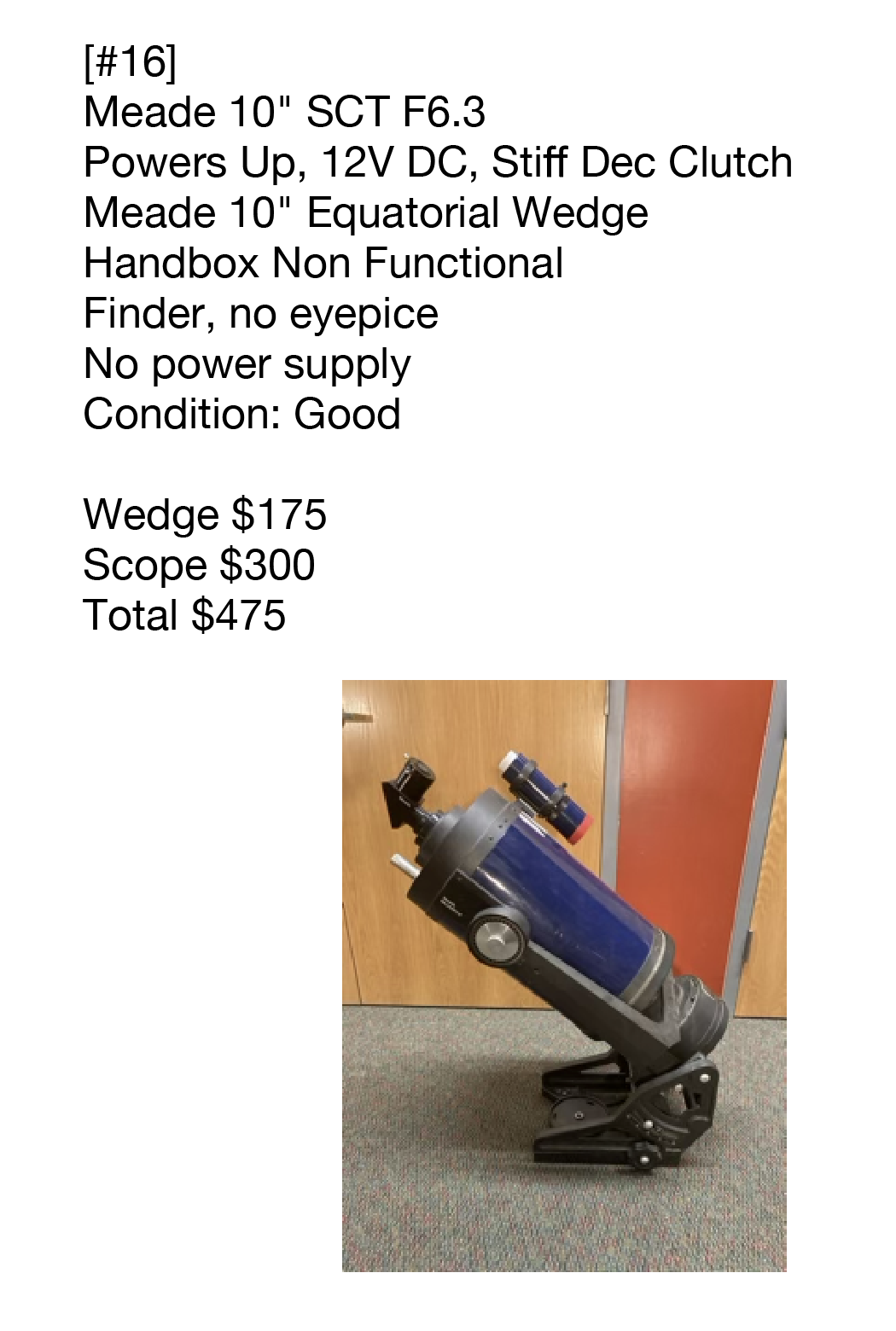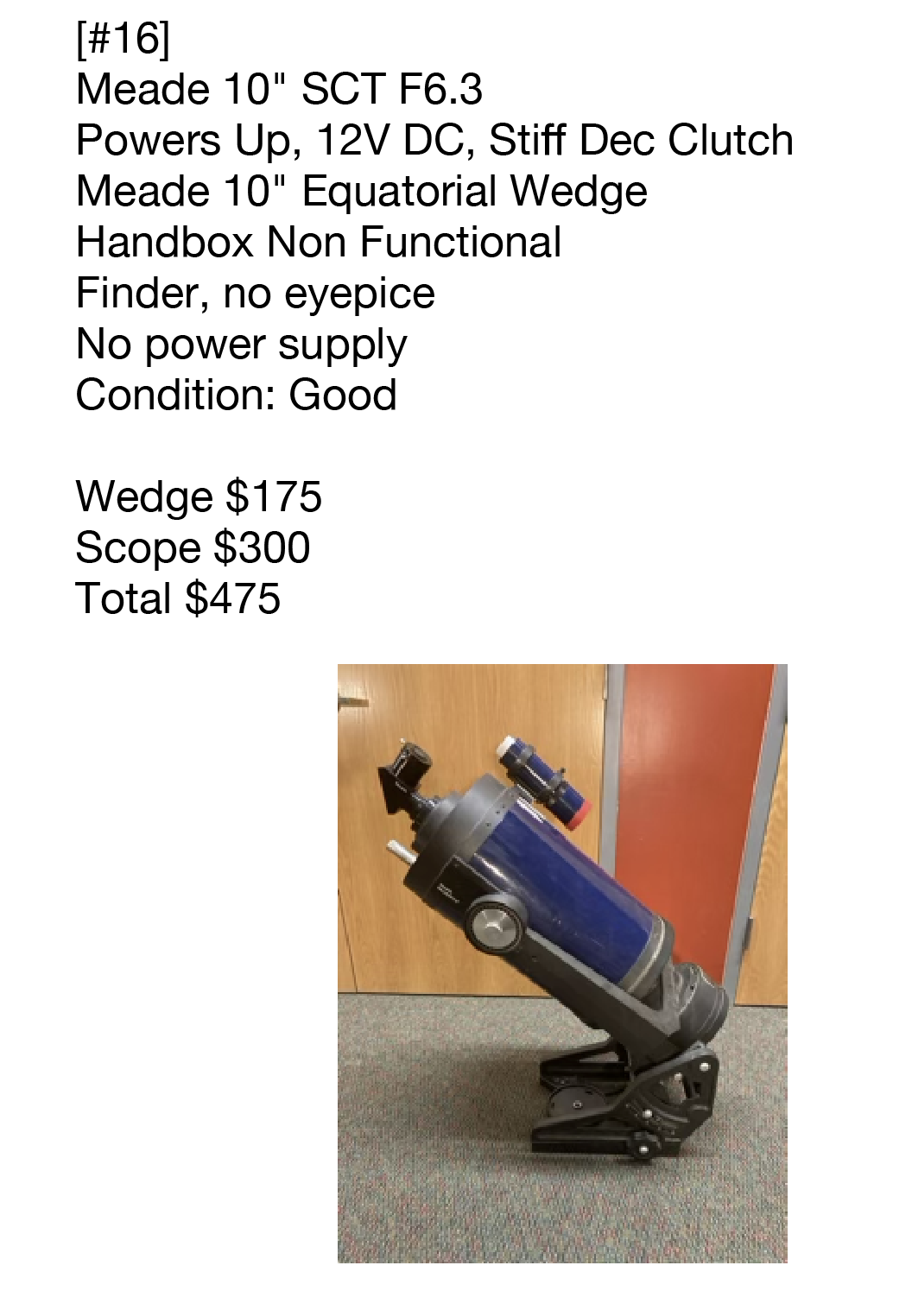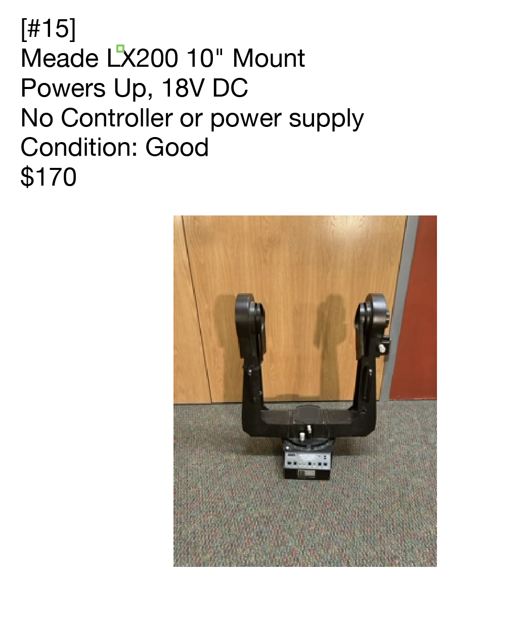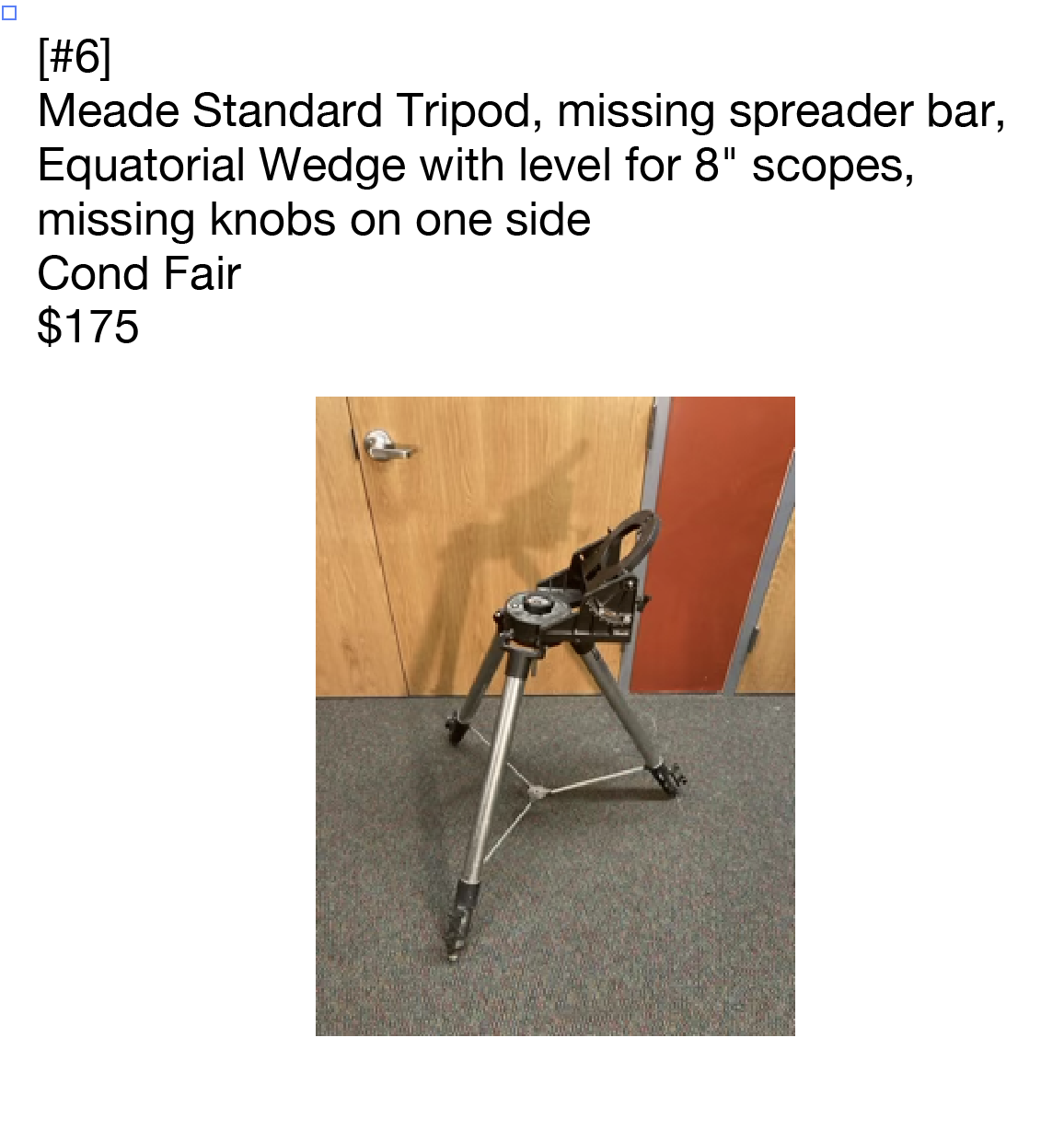 Send a list of your items to swapmeet@cinastro.org and we will add it to this page before the event date.